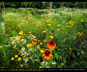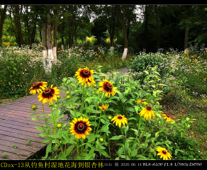 在唐昌镇柏条河畔有一个钓鱼村,从原唐元镇万寿社区沿柏条河畔绿道可步行或骑车到钓鱼村。钓鱼村湿地风光优美(不再一一报道,可看过去的照片)。进入钓鱼村就有一遍花海,你可沿着人工修建的栈道赏花。花海的野菊花,形态各异,五彩缤纷,显得十分原始、粗犷、自然,没有人工的雕琢和培植。花海紧连着是一遍银杏密林。夏日到此,格外惬意。
