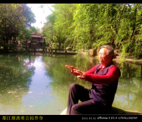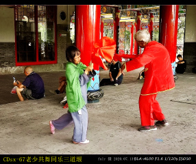 到郫都区三道堰镇堰桥乘凉消夏,看见一位中式着装白发老翁手提音响而来,打开音响便挥舞红绸折扇漫步起舞。老人已88岁高龄,自娱自乐,欢度晚年。后一位10岁的小姑娘也加入其中,老少共舞,一快一慢,配合默契。 我卡了几张照片,拍了两段视频(另见视频),以飨摄友。
